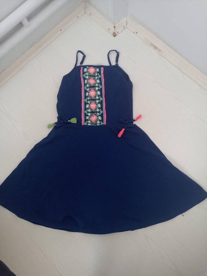 Lacivert renkli, askılı, nakışlı ve boncuk detaylı, bohem tarzda kız elbisesi.