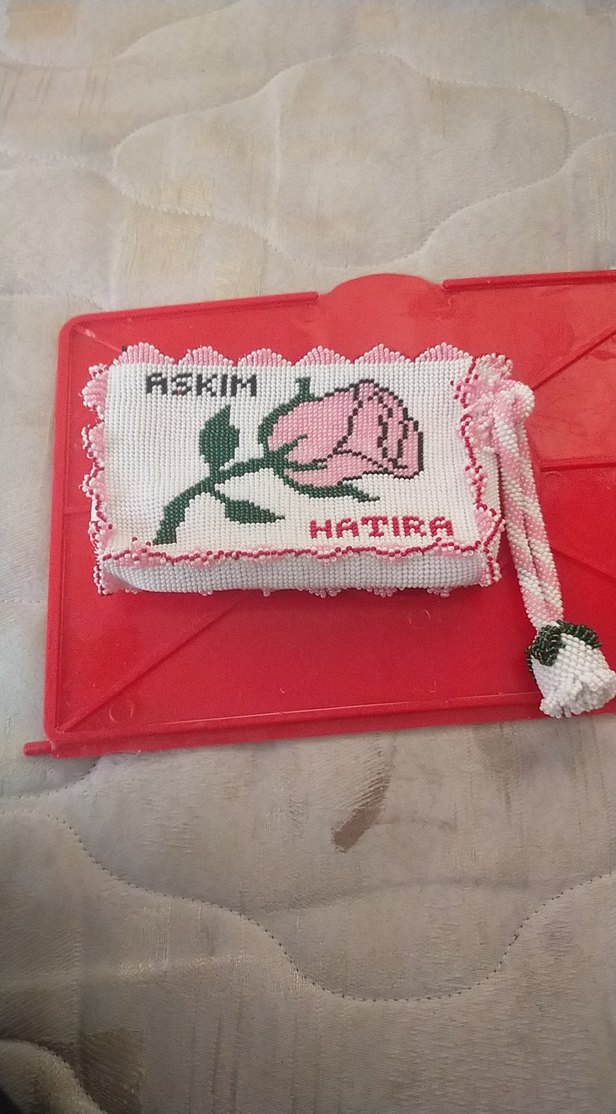 Nakışlı çiçek deseni ve boncuk işlemeli, açık pembe renkli örgü kadın cüzdanıdır. "ASKIM" ve "HATIRA" yazılıdır, vintage tarzda küçük boncuklu püskülü vardır.