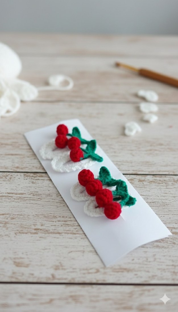Nakışlı beyaz taban üzerinde kırmızı boncuklu kiraz ve yeşil yaprak detaylı, renkli çocuk tokaları seti. adet fiyatı 40 tl