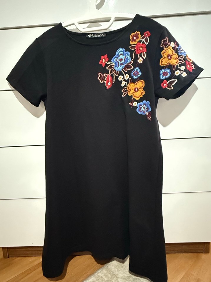 Kısa kollu, yuvarlak yaka ve bol kesim siyah kız tişörtü. Renkli nakışlı çiçekler ve boncuk detaylarıyla dikkat çeker.