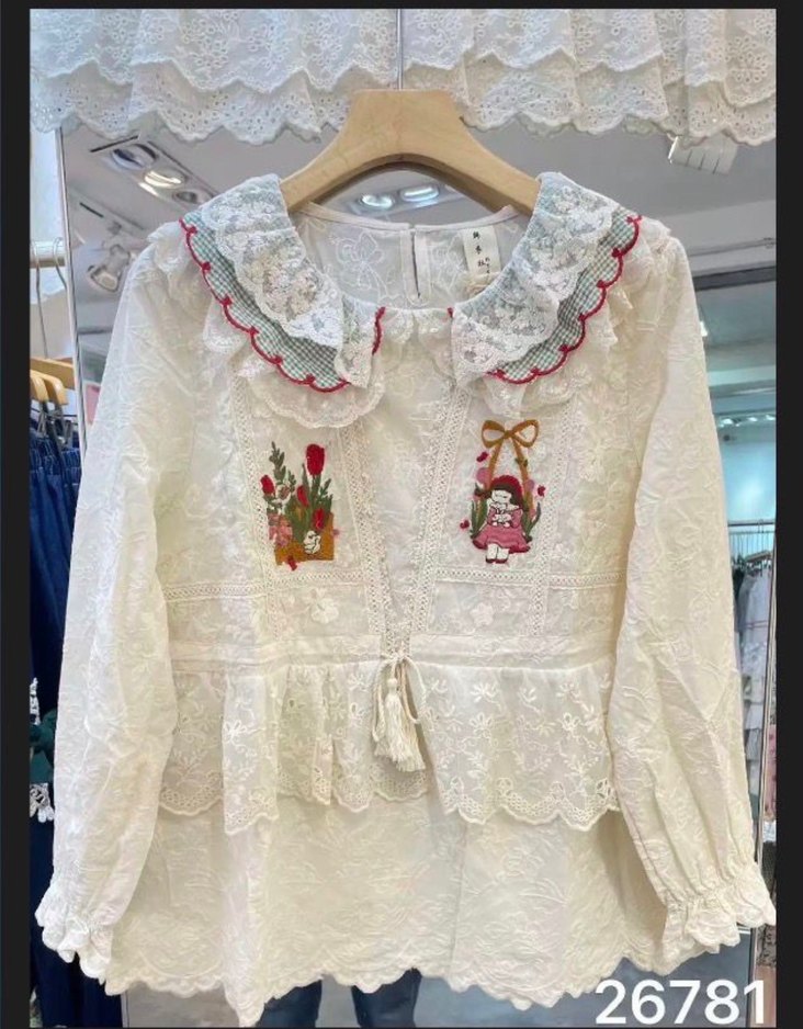 Pamuklu, uzun kollu, beyaz bohem tarzı kız bluzu. Nakış ve dantel detaylarıyla süslenmiş, bol kesim ve yuvarlak yaka içerir.