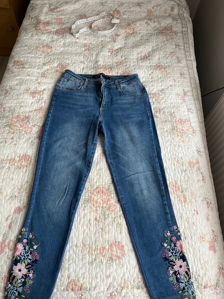 Nakışlı ve Dantel Detaylı Mavi dar Kesim Kot