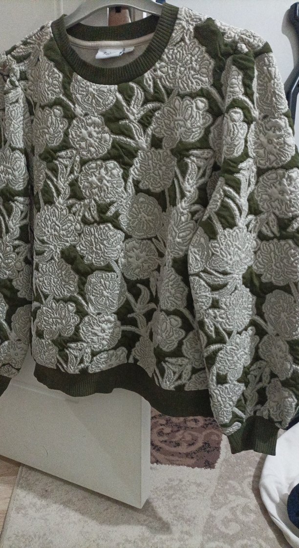 Gri renkte, nakışlı ve dantelli, bohem tarzda, yuvarlak yakalı ve uzun kollu, bol kesim kadın kazak. Rahat ve günlük kullanıma uygun.