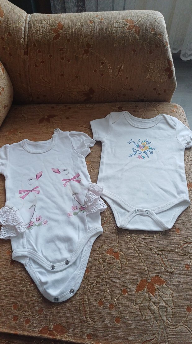 İki adet pastel beyaz kız bebek kısa kollu body; biri nakışlı çiçek ve fiyonk detayları ile dantel süslemeli, diğeri sade nakışlı çiçek desenli.