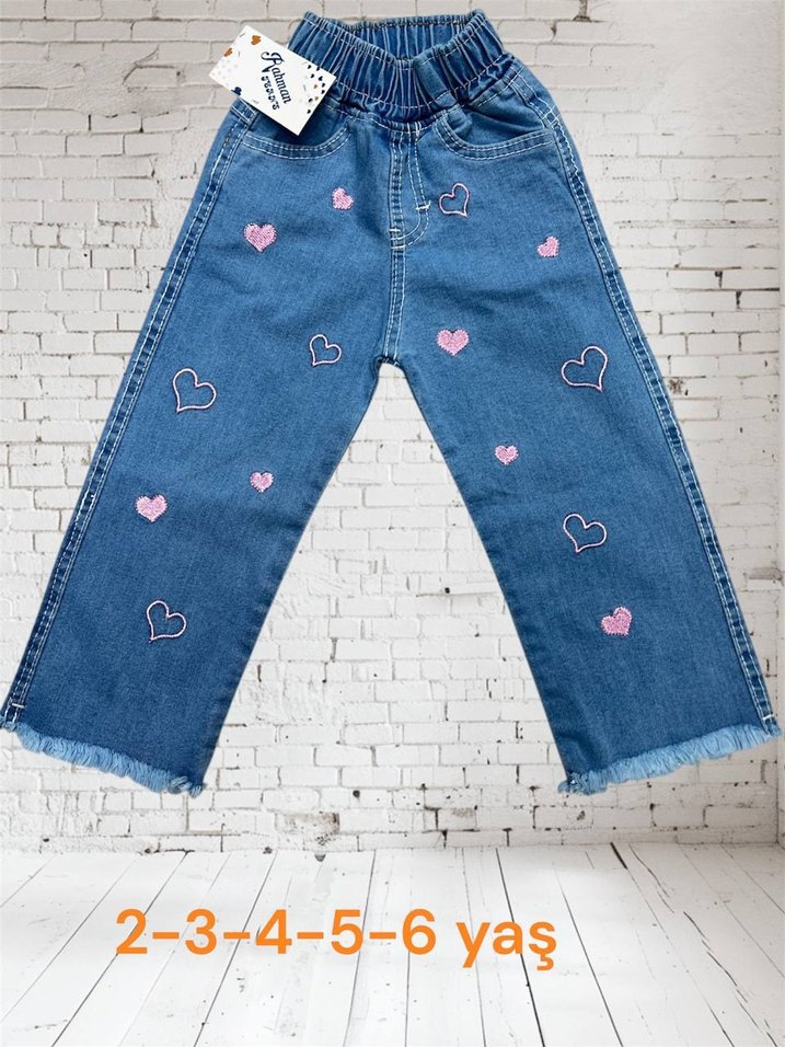Nakışlı renkli kalp desenleri ve dantel detaylı mavi denim kız pantolonu. Lastikli beli ve regular kesimiyle 2-6 yaş arası için uygundur. Sokak stili tarzında.
