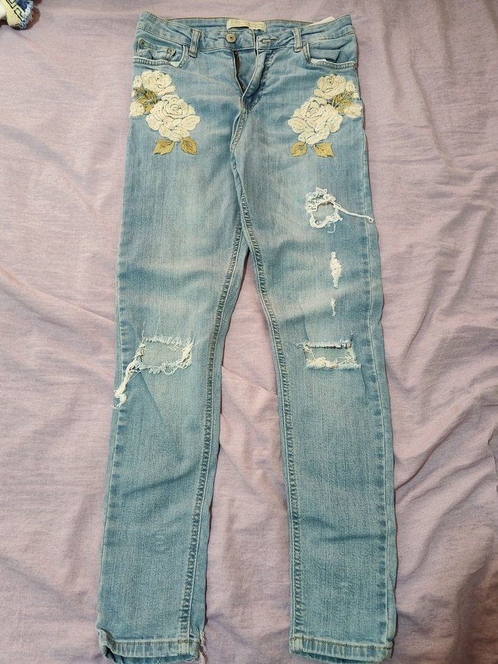 Nakışlı çiçek desenleri ve dantel detaylı, mavi kot pantolon. Günlük rahat sokak stili için uygundur. 28 beden