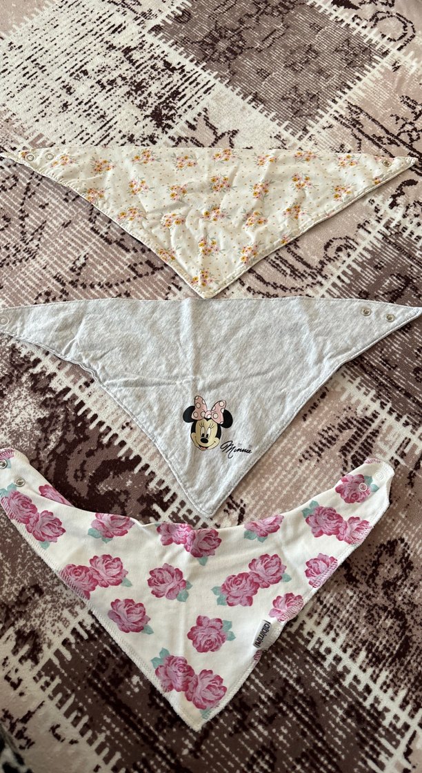 Gri, beyaz ve pembe renklerde, nakışlı Minnie Mouse ve çiçek desenli üçgen bebek önlükleri. Yumuşak ve rahat kumaş.
