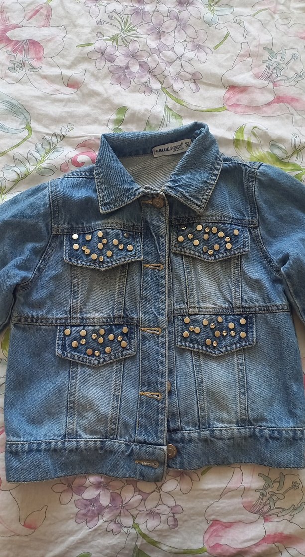Düğmeli ve taş detaylı mavi kot ceket, uzun kollu, günlük sokak stili için uygun.