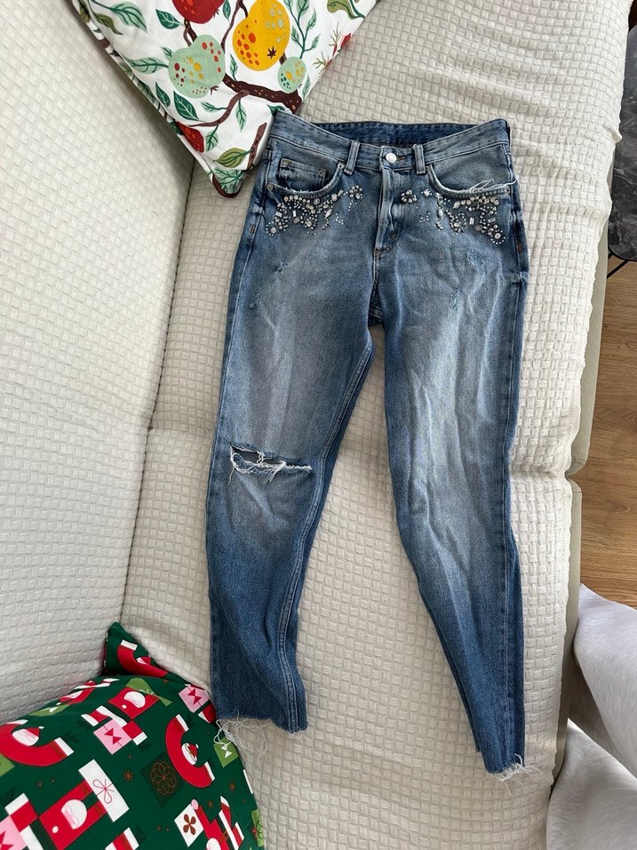 24 beden Nakışlı ve payet detaylı cepleriyle bol kesim mavi denim jean. Normal midi boyda, günlük sokak stili için uygun. ✨