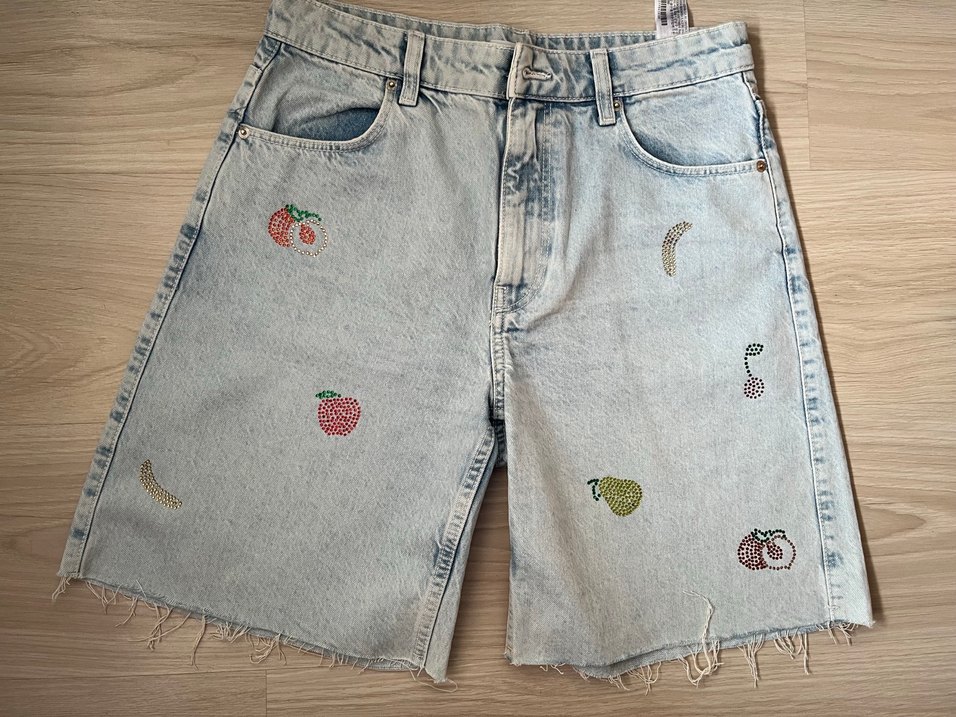 Bol kesim kısa kot şort, nakışlı meyve desenleri ve payet detaylarıyla günlük bohem tarzı için uygundur.