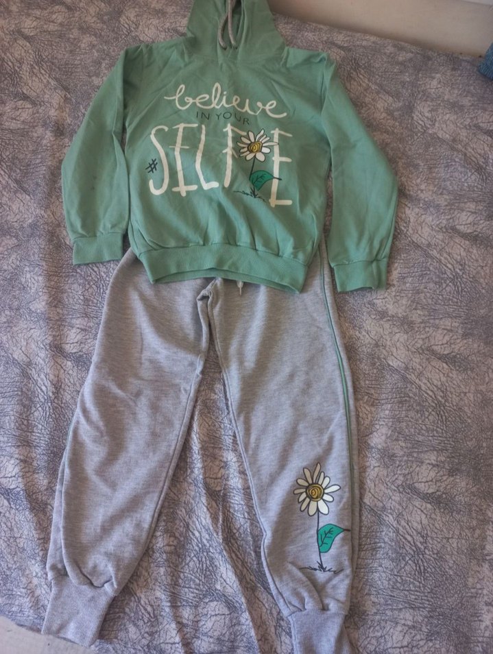Bol kesim, uzun kollu ve bisiklet yaka kız sweatshirt ve eşofman. Sweatshirt yeşil, nakışlı ve payetli detaylı, gri eşofman ise çiçek nakışlıdır. kolunda leke var