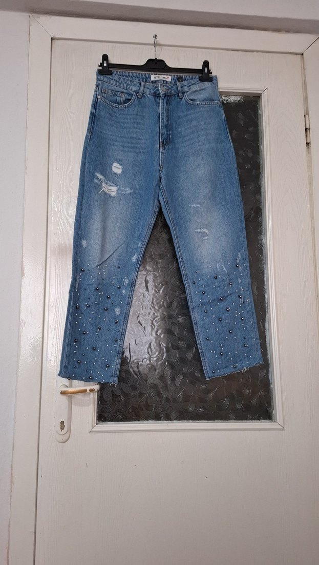Mavi denim, bol kesim kot pantolon. Alt kısmında nakış ve payet detayları ile günlük rahat sokak stili için uygundur. Bel 38 boy 94,5 cm.