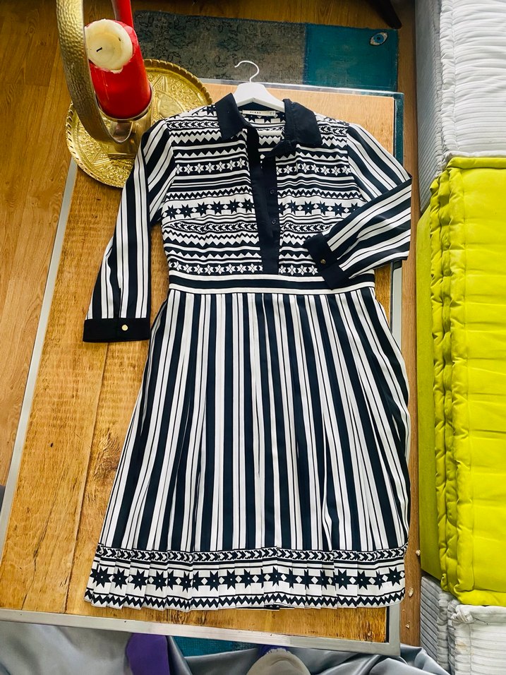 Kadınlar için uzun kollu, yakalı ve regular fit elbise. Nakışlı desenleri ve piliseli detaylarıyla siyah-beyaz çizgi ve yıldızlar bulunur.