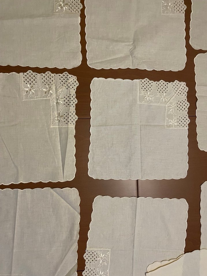 Nakışlı detaylara ve dalgalı kenarlara sahip vintage beyaz masa örtüsü, hafif gri tonlarıyla klasik bir görünüm sunar. ️12+1 adet ölçüleri fotoğrafta görüldüğü gibidir