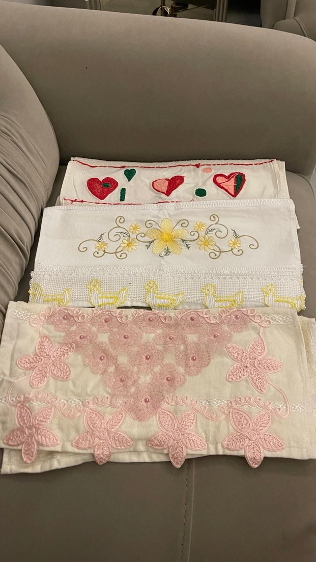 Nakışlı, pastel renkli çiçek ve kalp desenlerine sahip vintage beyaz havlular, banyonuza zarif bir dokunuş katıyor.