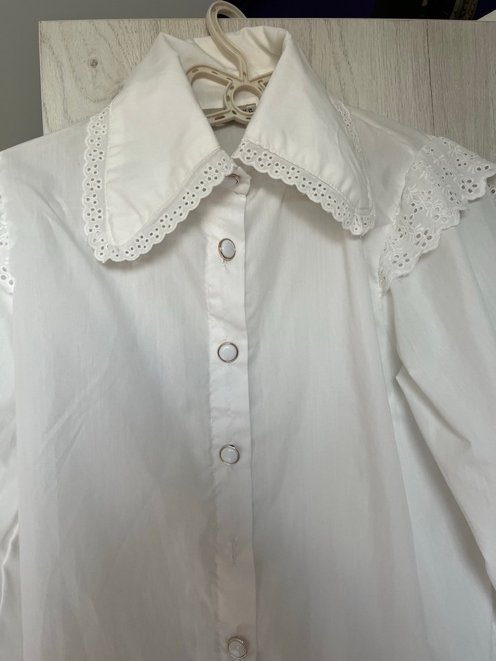 Bohem tarzda, nakışlı beyaz keten gömlek. Düğmeli, dantel detaylı yakası ve kısa kollu, bol kesim ofis gömleği.
