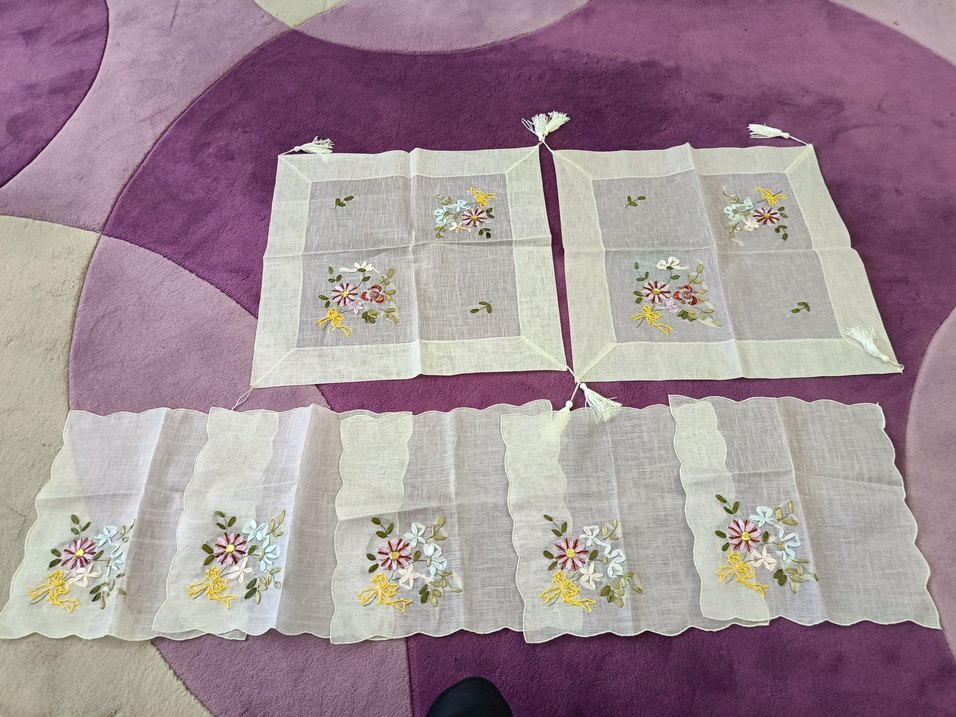 Pastel renklerde nakışlı çiçek desenleri ve zarif püsküllerle süslenmiş beyaz vintage masa örtüsü. sıfır hiç kullanılmadı, 5 kuçuk iki orta büyüklükte birinde bir püskül eksik son resimlere bakın bide sarı leke var yıkanınca geçer diye düşünüyorum