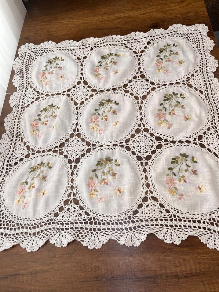 Pastel nakışlı çiçek desenleri ve ince dantel kenarlarıyla beyaz vintage masa örtüsü, klasik bir dokunuş sunar.