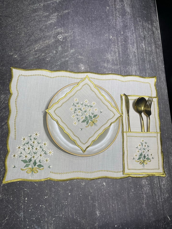 Vintage tarzda, beyaz ve sarı simli tonlarda nakışlı çiçek desenleri bulunan amerikan servis seti. Peçete ve çatal-kaşık kılıfı içerir.