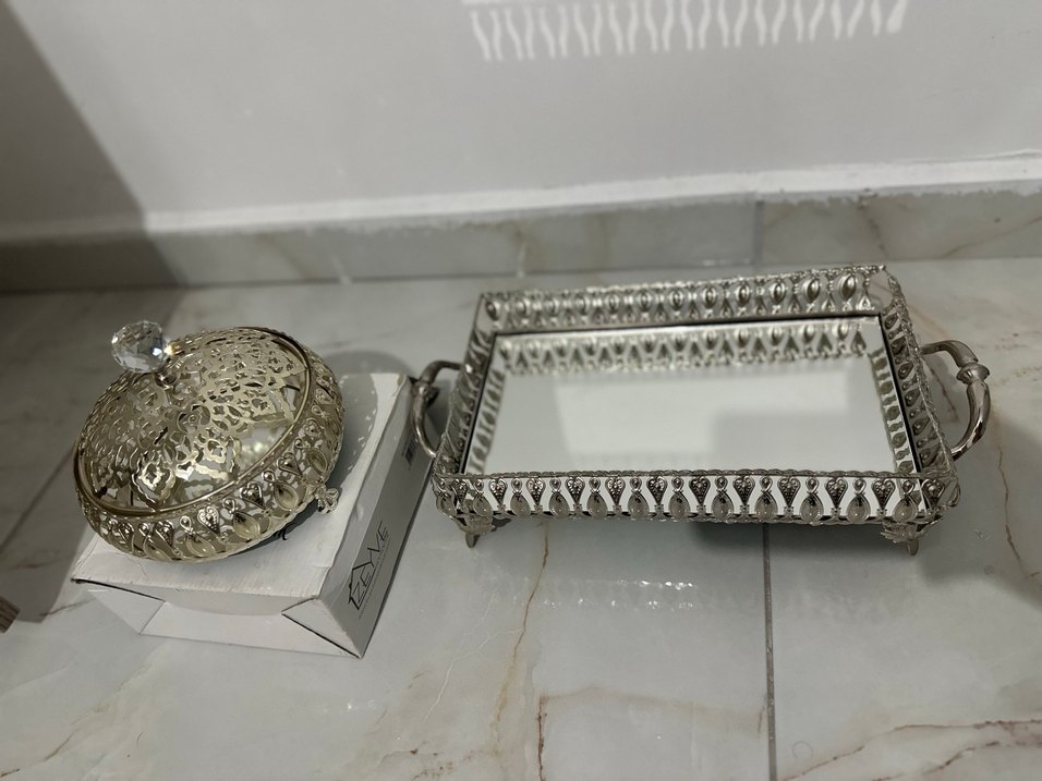 Nakışlı desenlere sahip parlak vintage gümüş tepsi, sunum veya dekorasyon için uygundur. Ve şekerlik