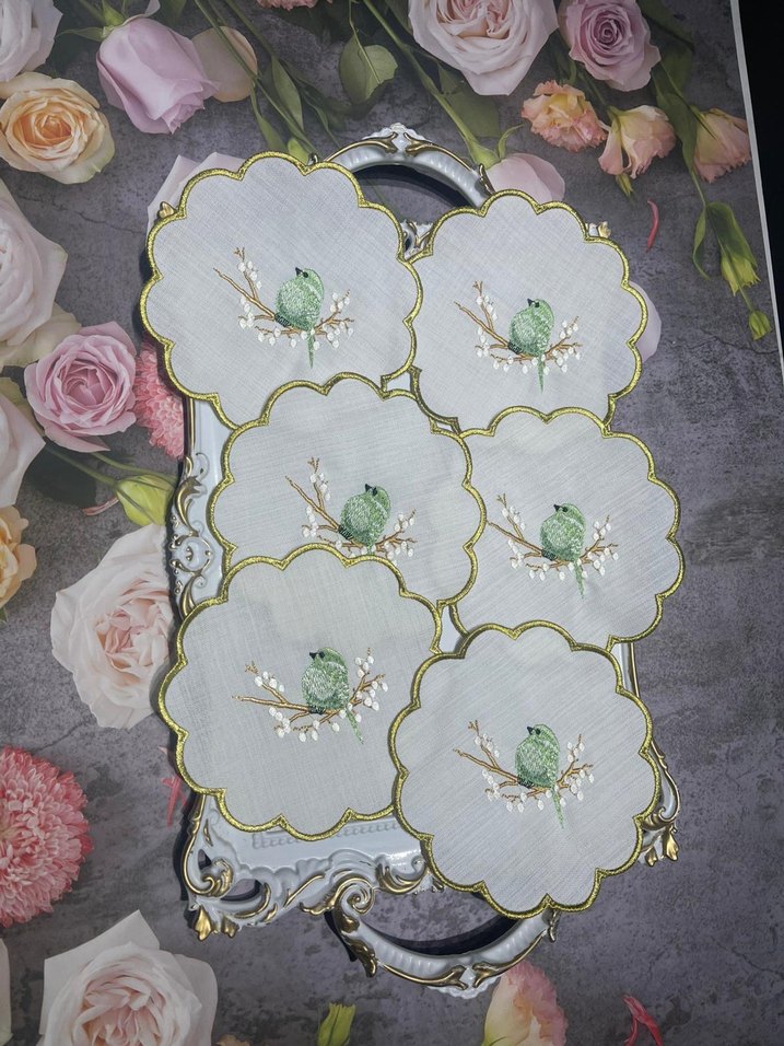 Vintage tarzında, yeşil kuş nakışlı, altın bordürlü, dalgalı kenarlı zarif peçeteler. İsterseniz 6 lı aynı renk isterseniz 6 lı farklı renklerde seçeneklerimiz mevcuttur