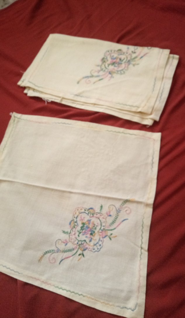 Vintage tarzda, pastel tonlarda çok renkli nakışlı desenlere sahip hafif kumaştan masa örtüsü. 4 tane var mutfak dolabı örtüsü olarak kullanılmış iyi durumda