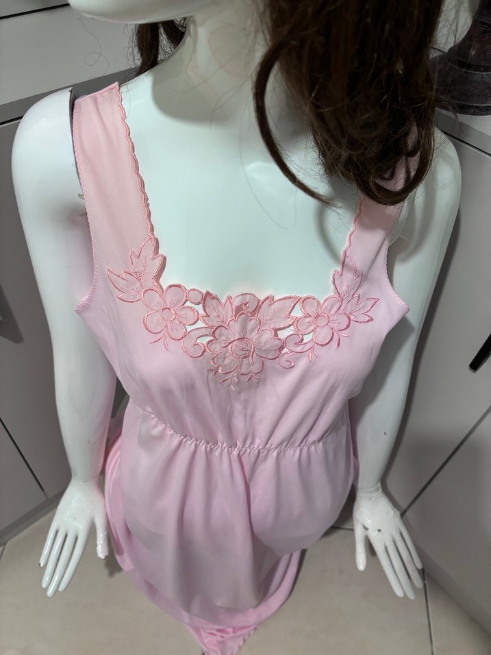 Nakışlı çiçek detayları ve bohem vintage tarzı olan, pembe renkli, kolsuz ve vücuda oturan midi uzunlukta kadın pijama