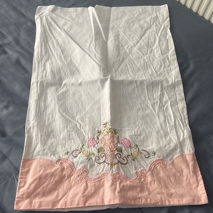 Vintage tarzda, pastel pembe nakış ve çiçek detaylarına sahip yastık kılıfı