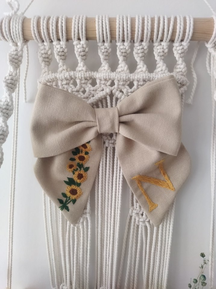 Bohem tarzda, ayçiçeği ve N harfi nakışlı beyaz fiyonk broş. Düğünler için uygun, hafif ve şık.