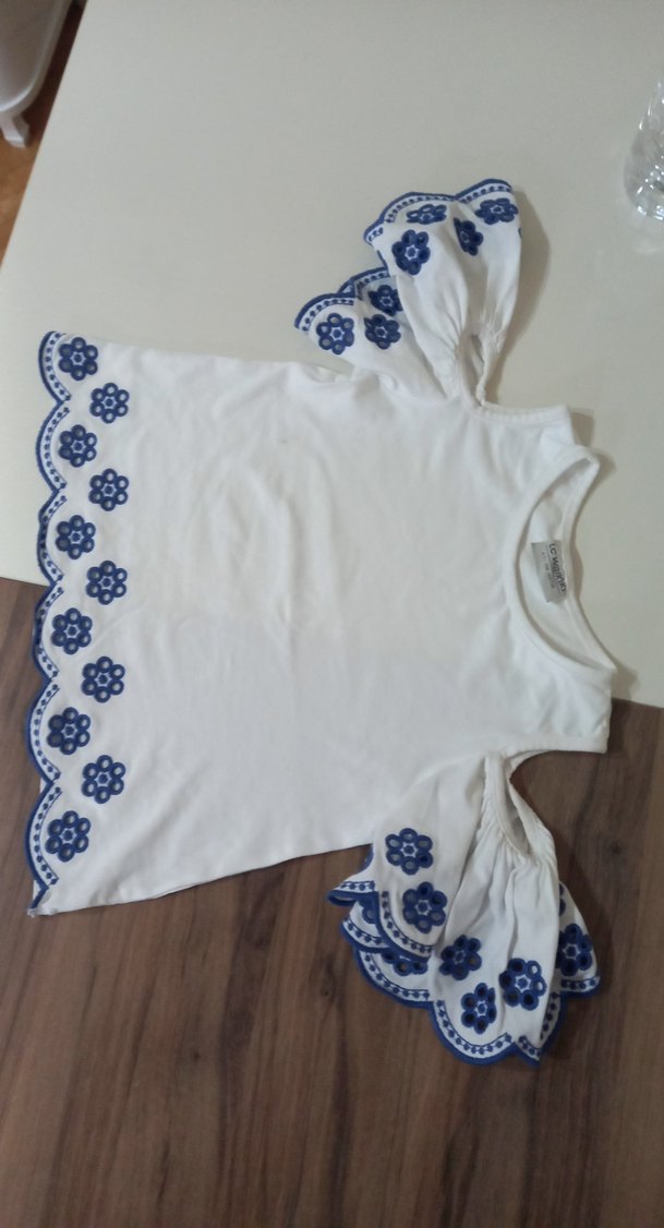 Mavi çiçek nakışlı, kısa volanlı kollu, bol kesim beyaz kız çocuk tişörtü. Yumuşak tekstil kumaştan, yuvarlak yakalı.
