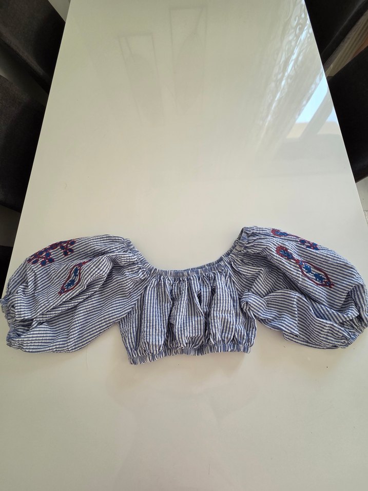 Bohem tarzda, tekne yaka ve bol kesim kadın bluz. Nakışlı desenler ve volan detaylarına sahip, askılı kollu, çok renkli gri tekstil kumaş.