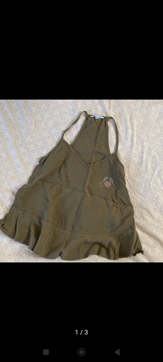 Keten kumaştan, volanlı ve nakışlı detaylara sahip, kolsuz ve bol kesim khaki renk mini kadın atlet. Askısız yakaya sahiptir, bohem tarz için uygun.