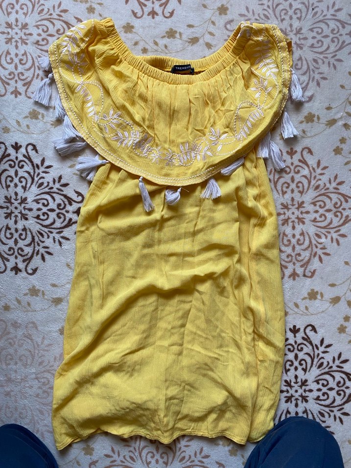 Nakışlı detaylara ve volanlı süslemeye sahip sarı, kolsuz . Yumuşak keten kumaştan, rahat kesim ve askısız yaka ile bohem tarz.