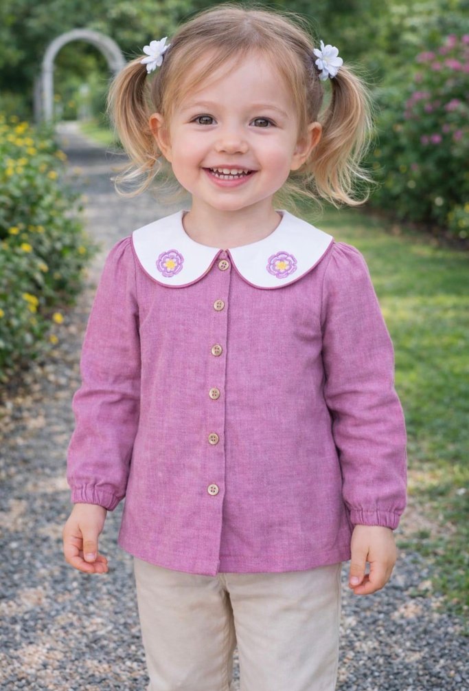 Pembe pamuk kumaştan, nakışlı yaka ve düğmeli uzun kollu, rahat kesim kız çocuk gömleği.