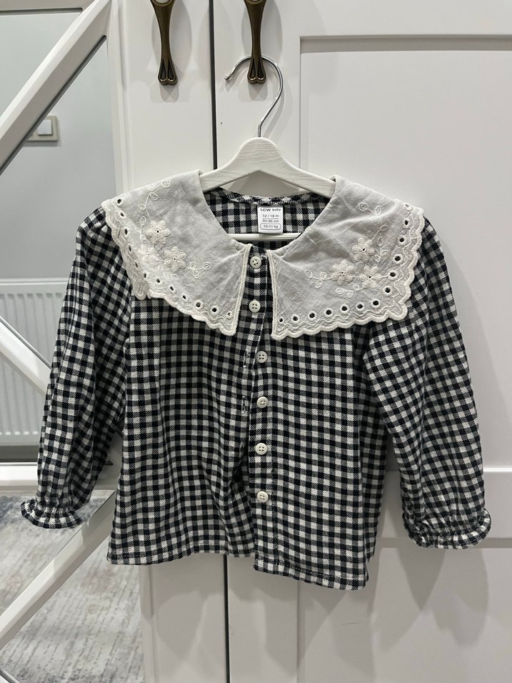 Bol kesim, düğmeli, yakalı kız bebek gömleği. Uzun kollu, pamuklu kumaştan, nakışlı yakasıyla siyah beyaz kareli desende. Günlük kullanım için uygun, Paris tarzı gotik şıklık sunar.