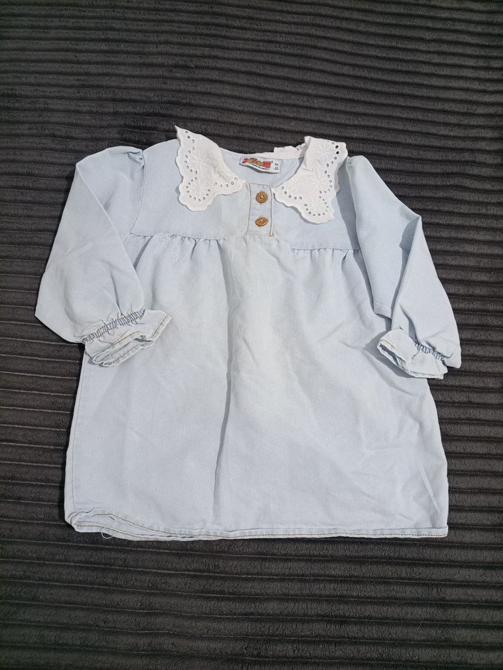 2-3 yaş sorunsuz Bol kesim, uzun kollu kız çocuk elbisesi, düğmeli ve nakışlı yakaya sahip. Yumuşak denim kumaştan, pastel beyaz renkte.