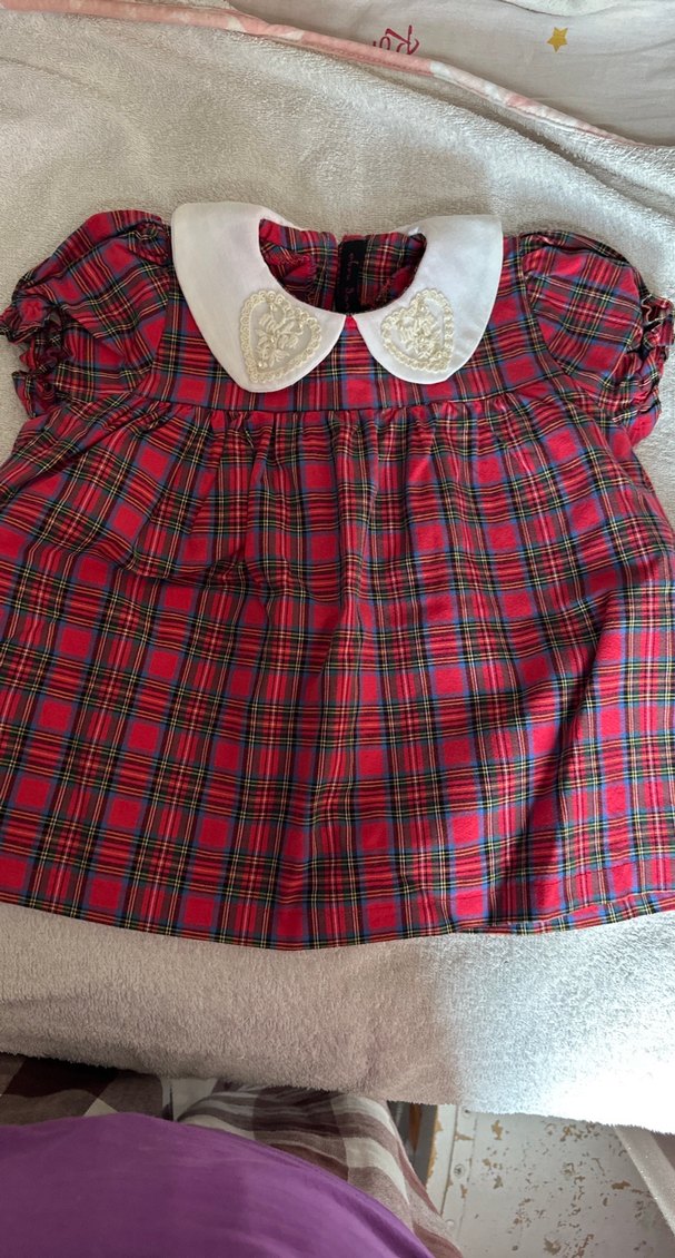 kırmızı ekose desenli, nakışlı beyaz yakalı, kısa kollu ve bol kesim kız çocuk elbisesi. Fırfır detaylarıyla süslenmiştir.