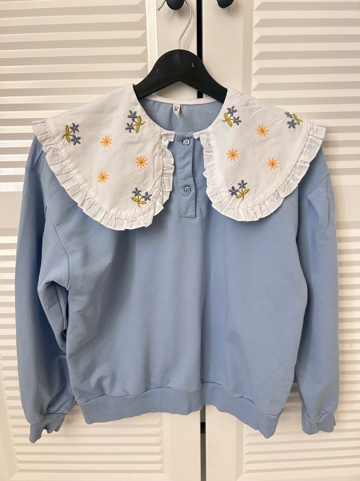Pamuklu, mavi renkli kız bluzu, nakışlı yaka detayı , yeni ama etiketsiz 1 defa giyildi
