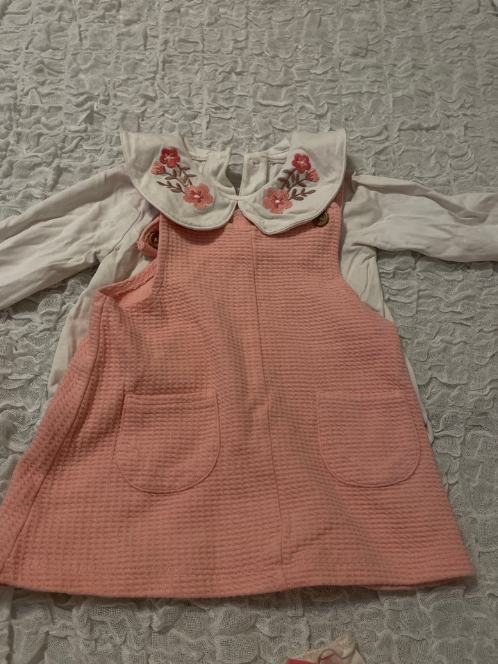 Nakışlı fırfırlı yakası olan, pastel pembe renkte, örme kumaştan, kolsuz ve bol kesim kız elbisesi. Bohem tarzda.