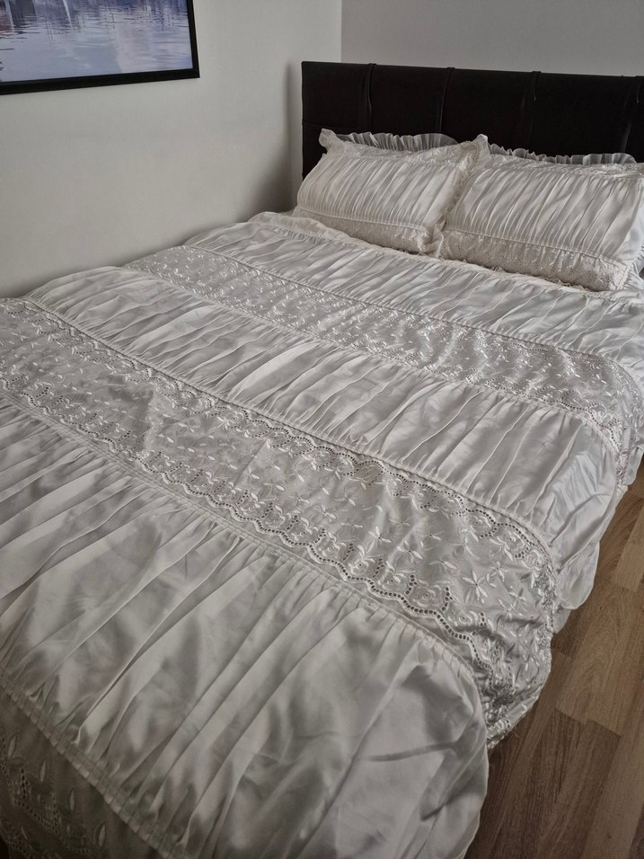 çift kişilik çeyizlik vintage nakışlı krem yatak örtüsü. Yumuşak ve zarif kumaş, yastık kılıfları ile birlikte. sorunsuz