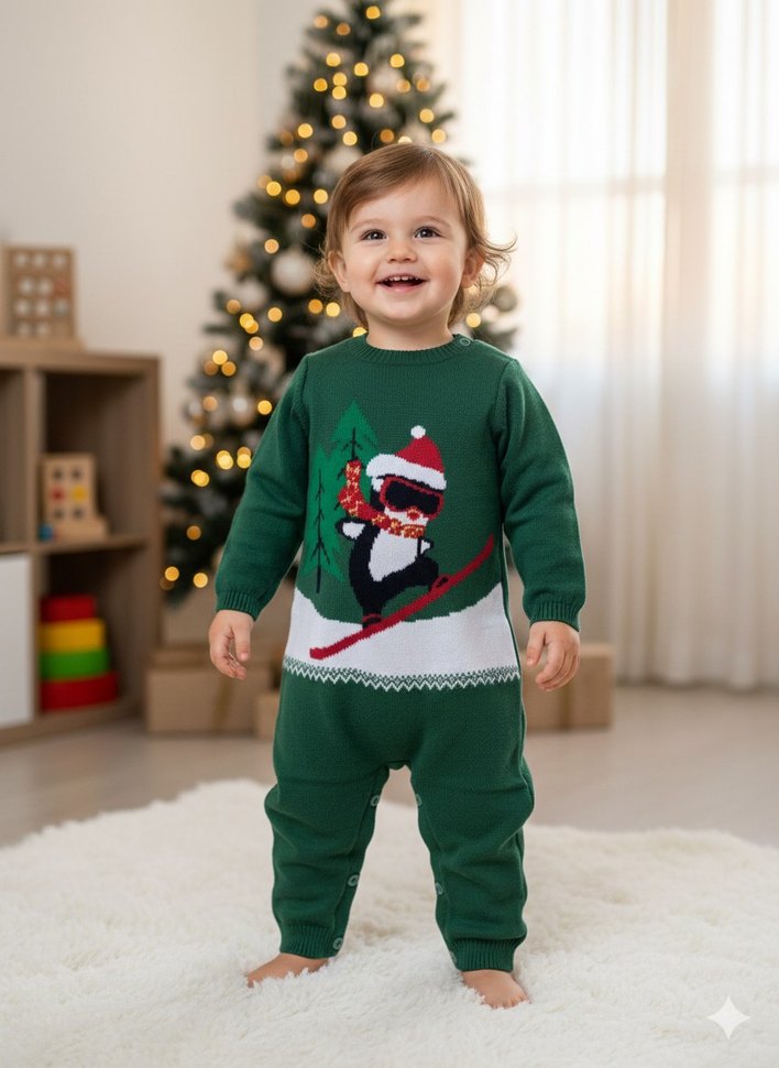 Nakışlı desenlere sahip koyu yeşil triko bebek tulumu, yumuşak ve sıcak tutan kumaştan üretilmiştir. ❄️