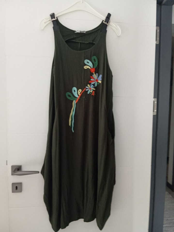 Koyu yeşil bohem elbise, nakışlı çiçek desenleri ve bol kesimiyle dikkat çeker. Kolsuz ve yumuşak sentetik kumaştan, drapeli görünümlüdür.