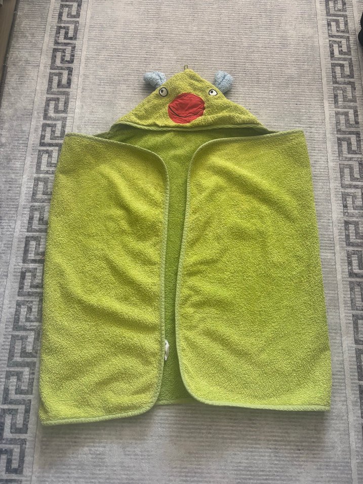 Nakışlı kapüşonlu, yumuşak ve emici kumaştan yapılmış renkli yeşil erkek çocuk boyu baş ucundan 80,ebi 120 cm dış kısmın rengi açılmış 6-7 yaşa kadar olur