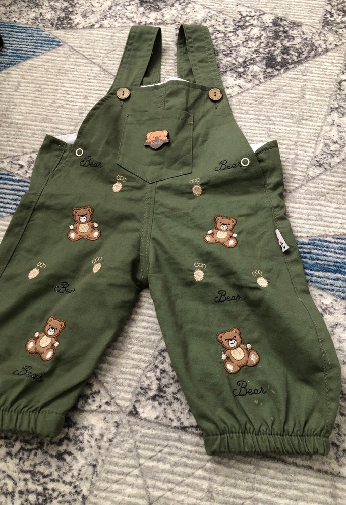 Düğmeli, nakışlı ayı desenli, bol kesim yeşil erkek çocuk salopet, ayarlanabilir askılı ve lastikli paçalı.
