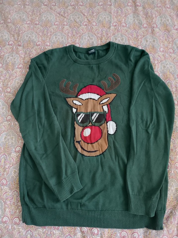 Yuvarlak yaka, uzun kollu, yeşil triko kazak. Renkli nakışlı geyik deseniyle, rahat ve salaş kesime sahip. Günlük ve parti kullanımı için uygundur.