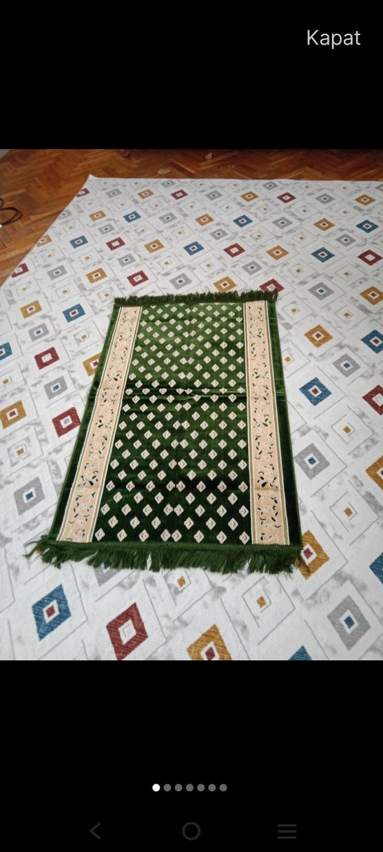 Nakışlı desenlere sahip yeşil zeminli, bej bordürlü ve püsküllü geleneksel tarzda halı. Renkli bir dokunuş sağlar.