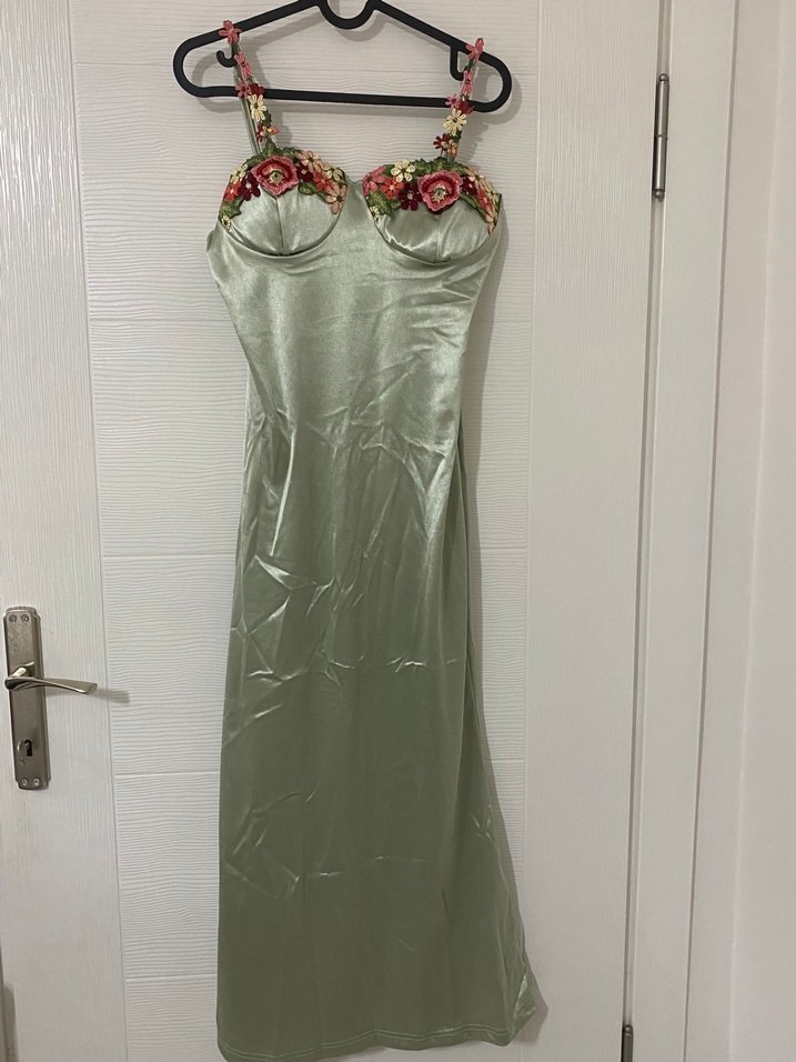 Nakışlı çiçek detaylı, straplez yakalı, ipek görünümlü, uzun ve vücuda oturan viral elbise. Düğün, mezuniyet vs için uygundur. Göğüs kalıbı süngerli. Yurt dışından alındı. Hiç Giyilmedi