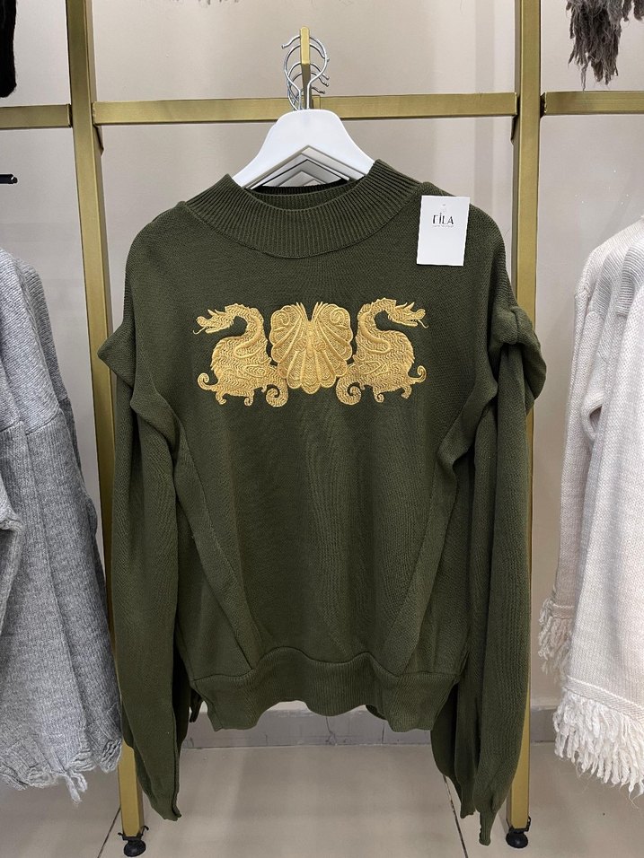 Uzun kollu, yuvarlak yakalı yeşil triko kazak, nakışlı detaylara sahip. Salaş kesim ve normal boyda, günlük kullanıma uygun rahat bir sokak stili kazak.