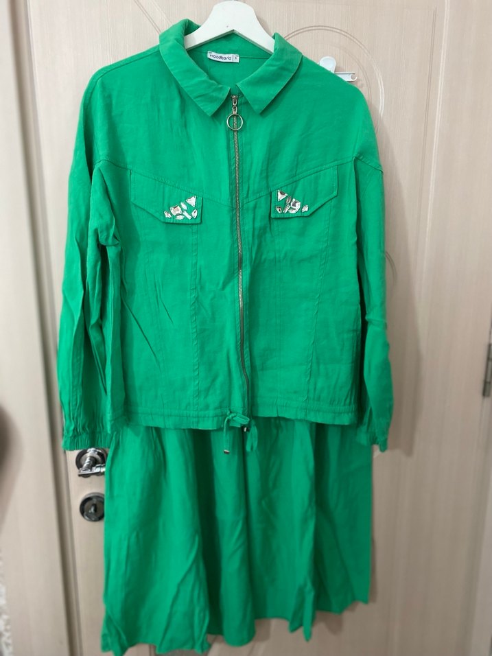 Yeşil renkli, uzun kesim, bol fit kadın takımı. Keten kumaştan, uzun kollu ve fermuarlı. Ceplerinde renkli nakışlar ve kesik yakası var.