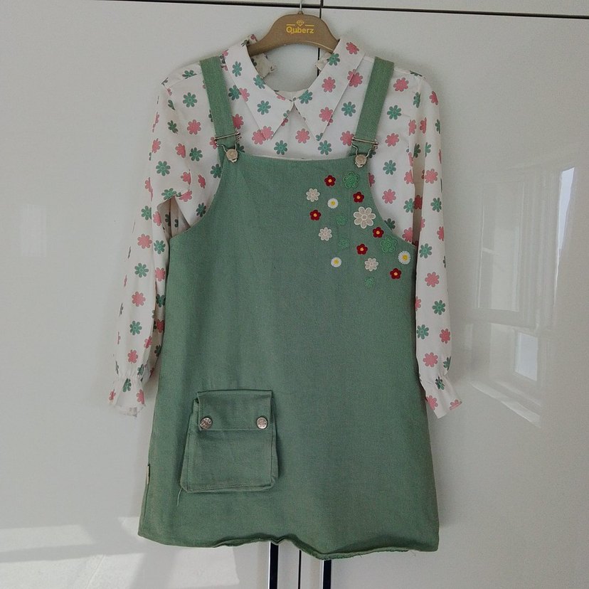 Nakışlı çiçek detaylı, düğmeli cepli yeşil kız salopet elbise. Yumuşak kumaş, uzun kollu pastel çiçekli gömlekle bohem tarzda.